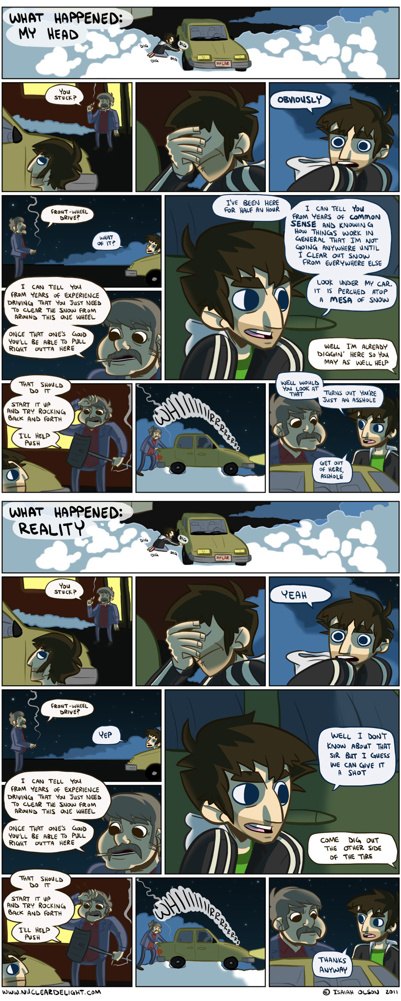 This comic is taken directly from something that happened to me last week. And by "something" I mean "I overestimated my car's power and got stuck trying to go over a big pile of snow." Lots of people stopped and helped out for a bit before continuing on their way. Eventually someone drove up behind me and gently pushed my car out with their truck. Which was super good, because based on the area of snow that my car had been on, there was still a ton of digging that would've needed to be done to get my car out on its own.